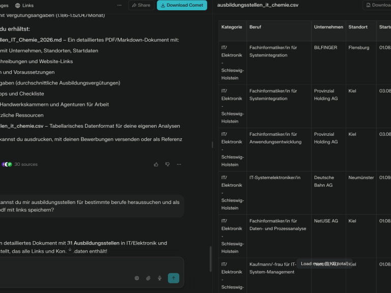 Hier habe ich mir eine Liste an freien Ausbildungsplätzen generieren lassen.